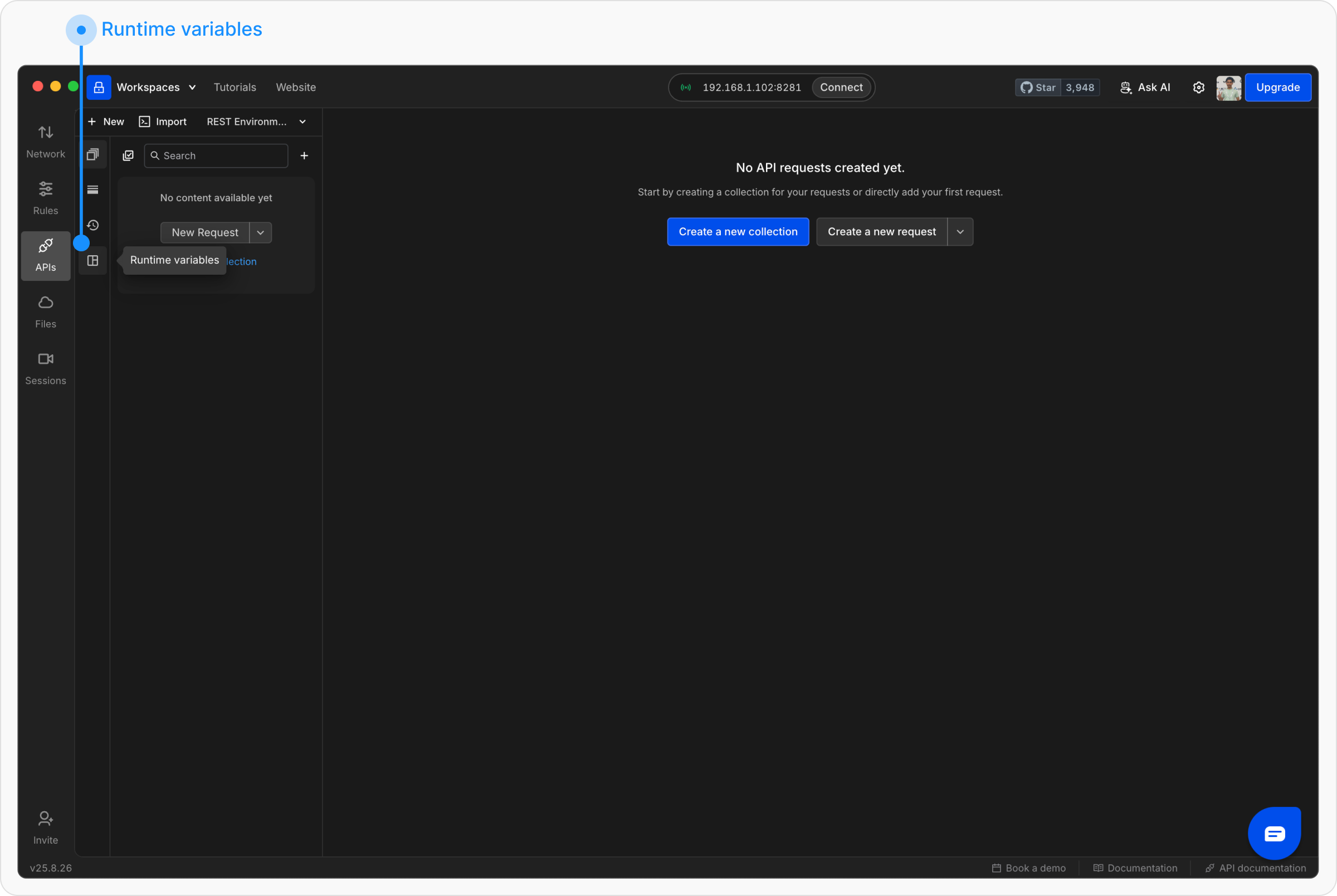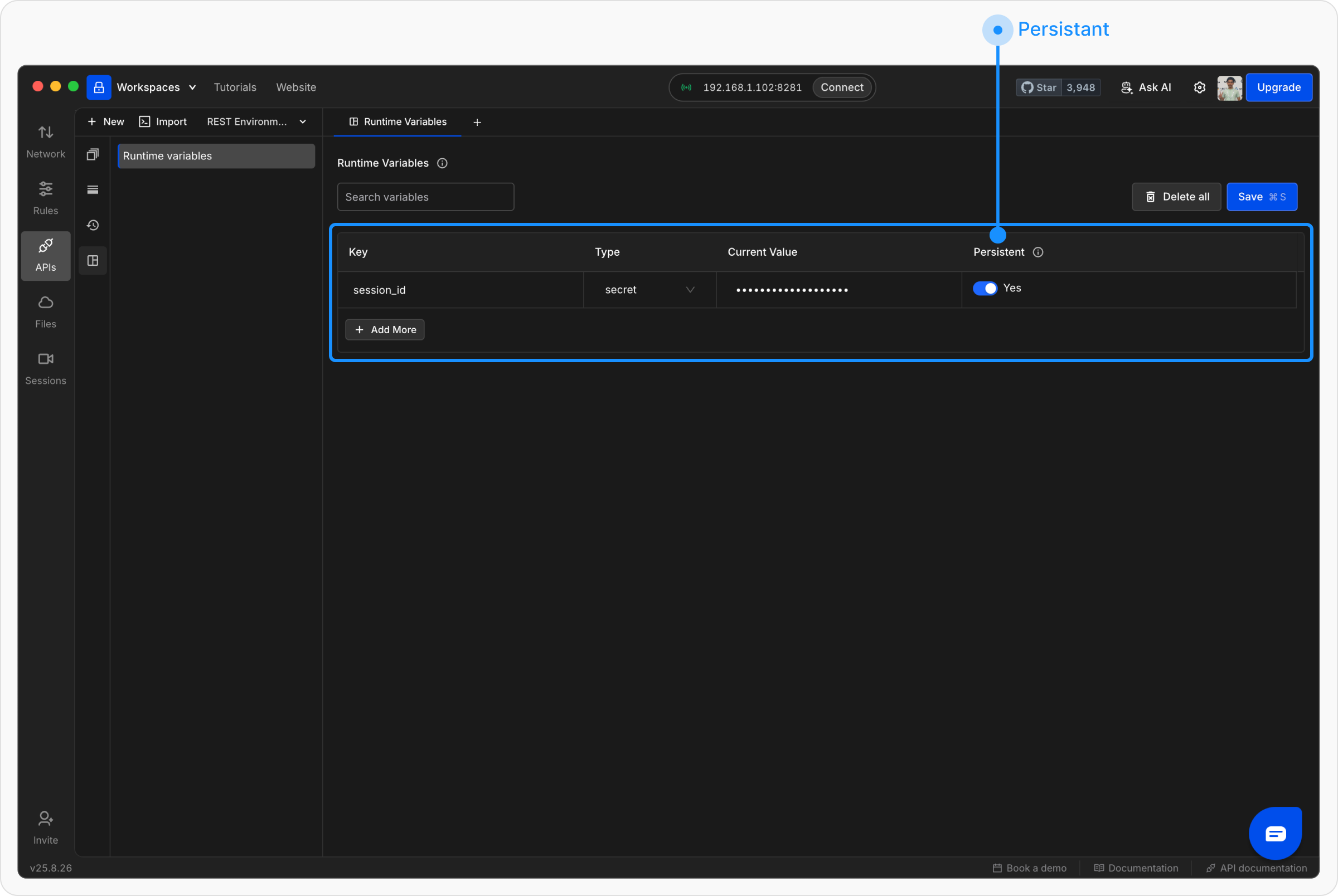 Runtime variables are designed to give you flexibility when testing APIs across different workspaces. Some common use cases include:- Quick testing: Store temporary values like access tokens or session IDs while debugging.