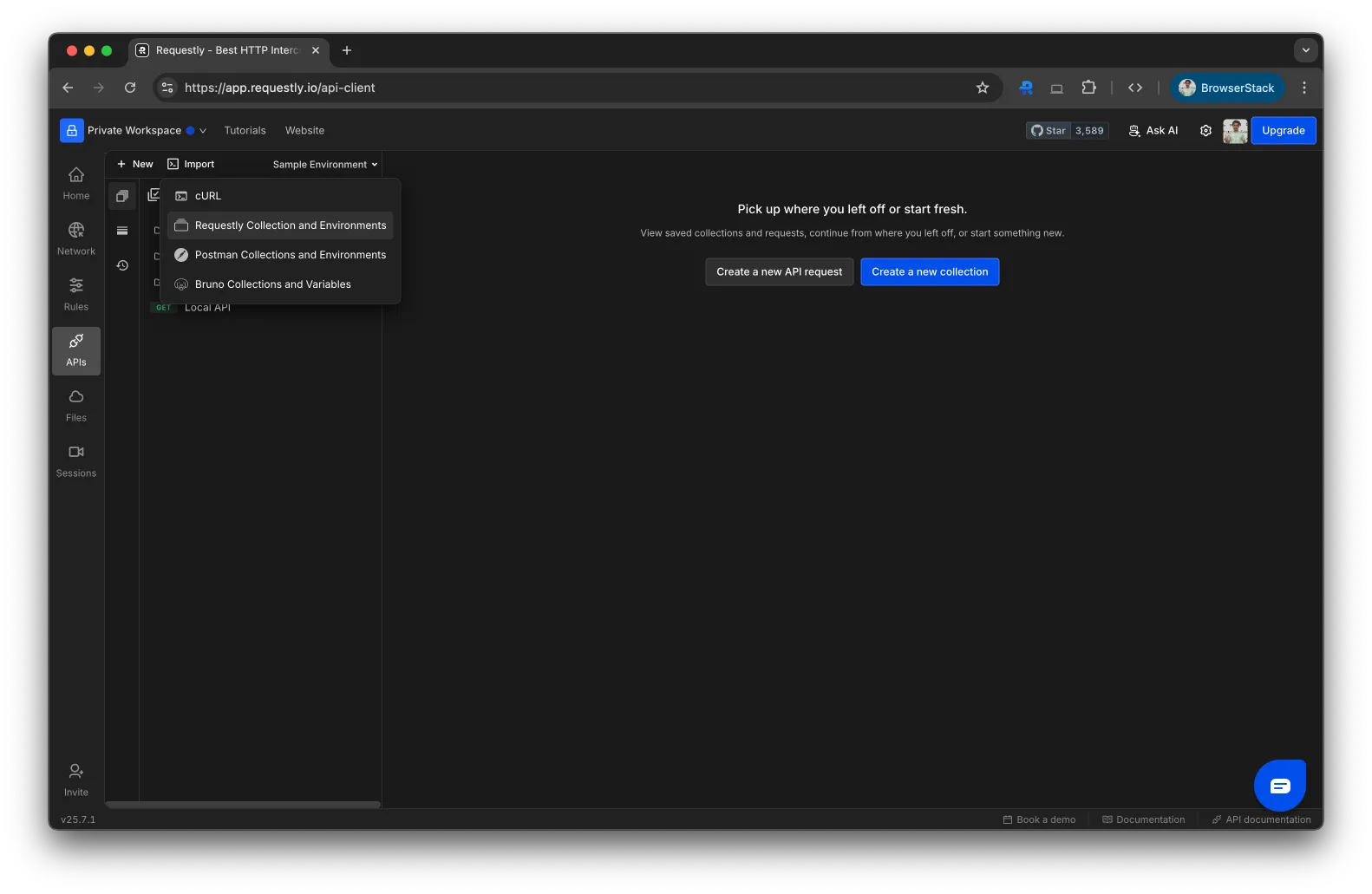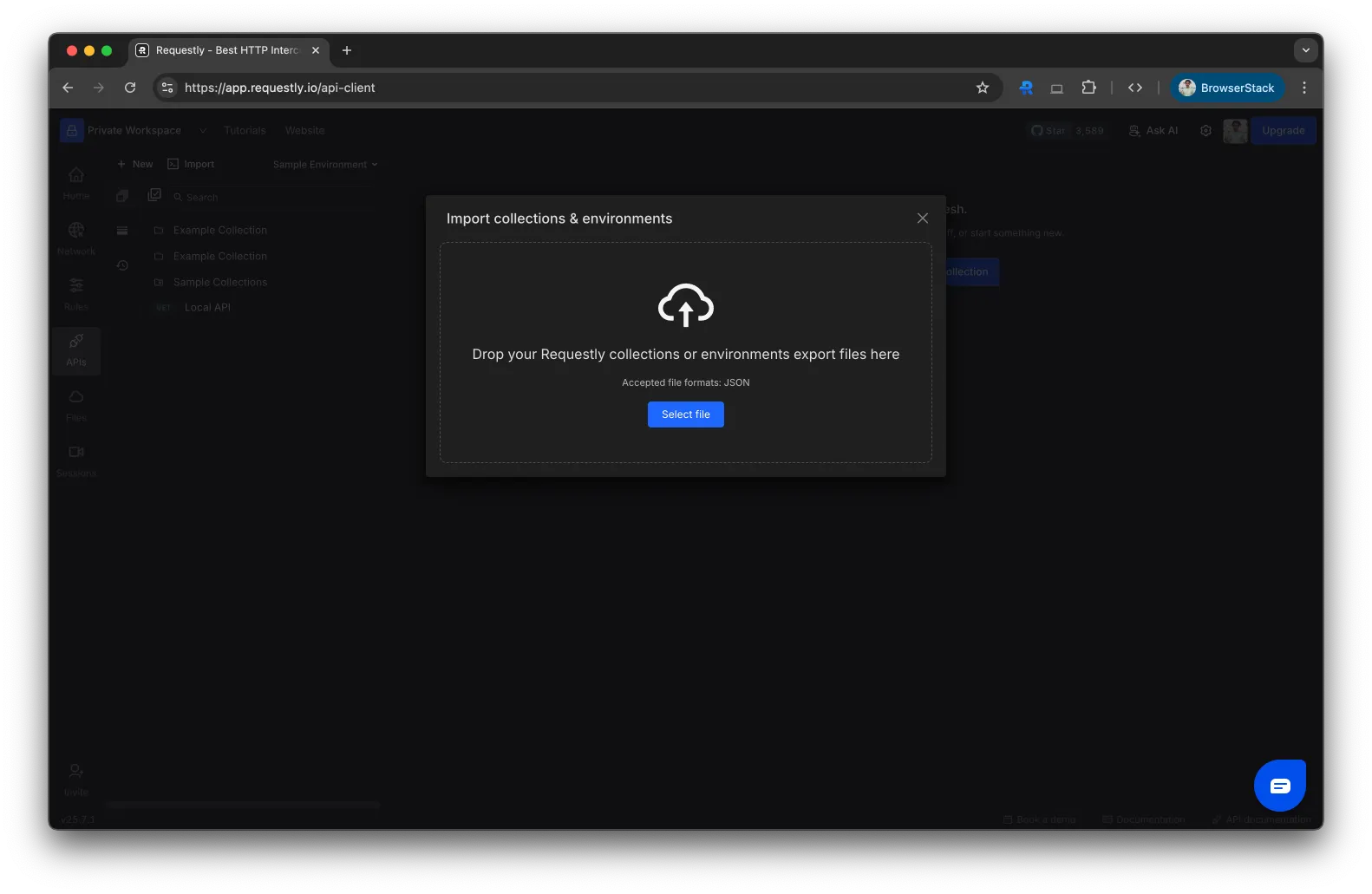 From the dropdown, choose Requestly’s Collection & Environment to open the import modal.