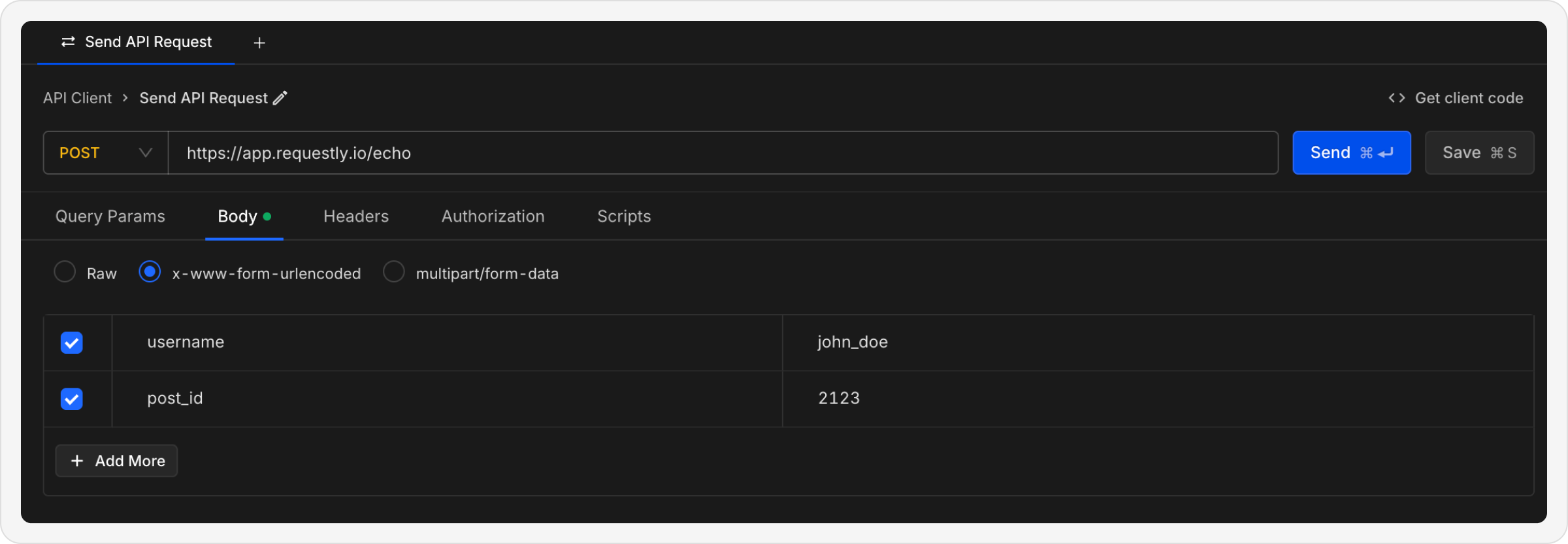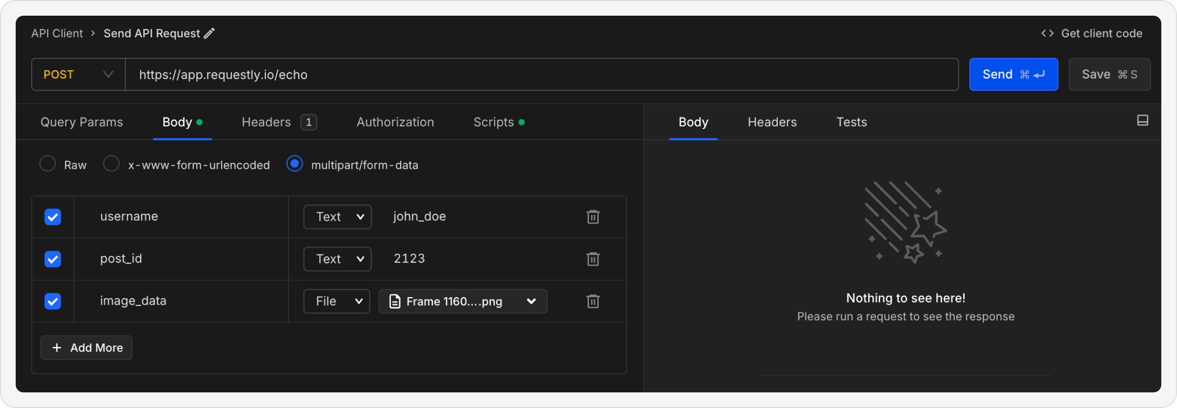 💡 Tip: For bothx-www-form-urlencodedandmultipart/form-data, you can add fields using the key-value form editor. If you need to send files, choose multipart/form-data.
