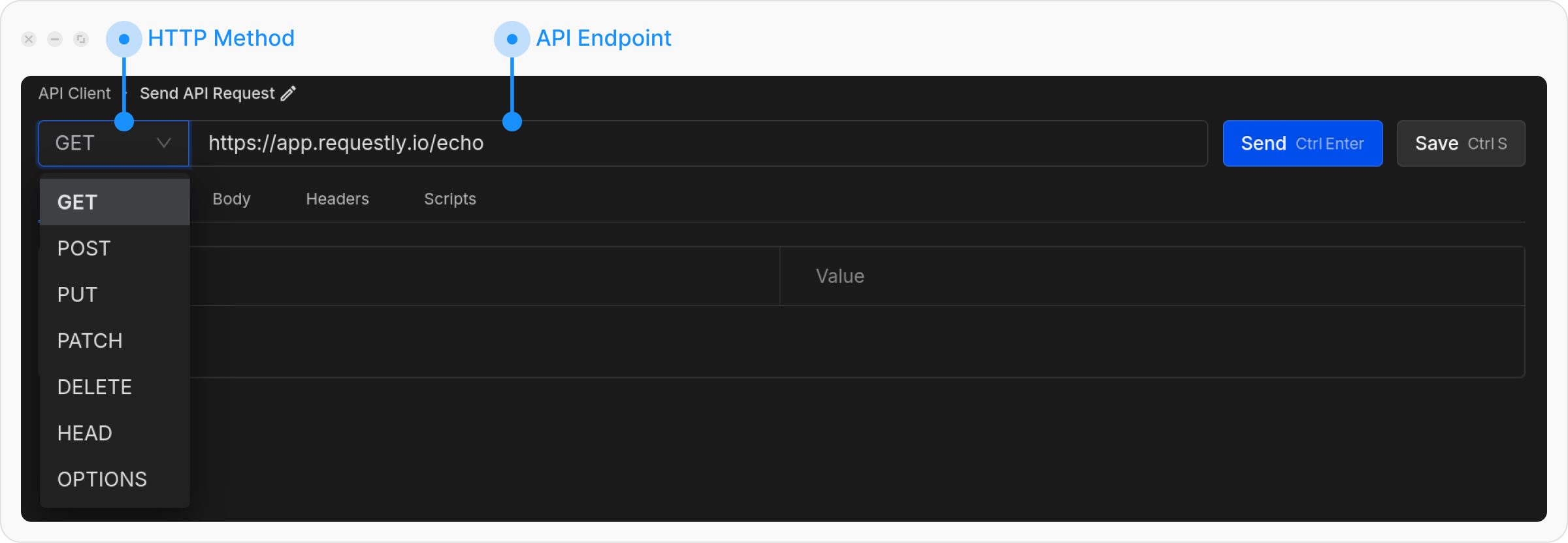 Pick the HTTP method (e.g., GET, POST) and type the URL of the API you want to test.
