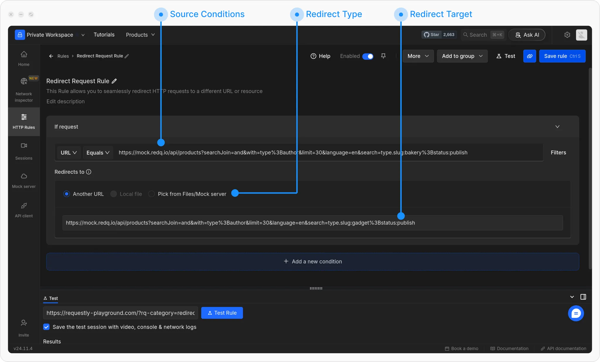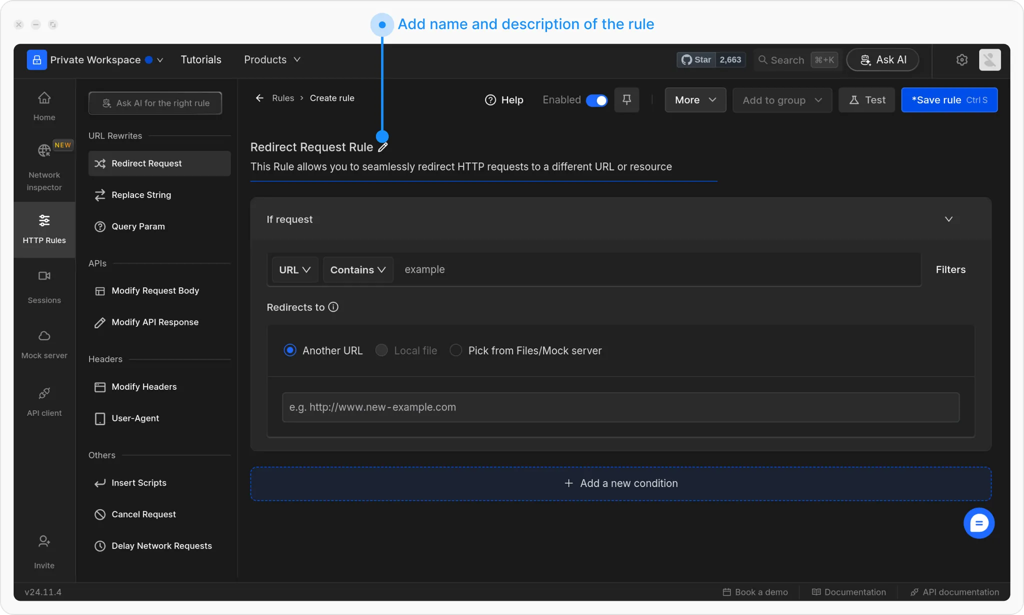Go to HTTP Rules → + New Rule → Redirect Rule.