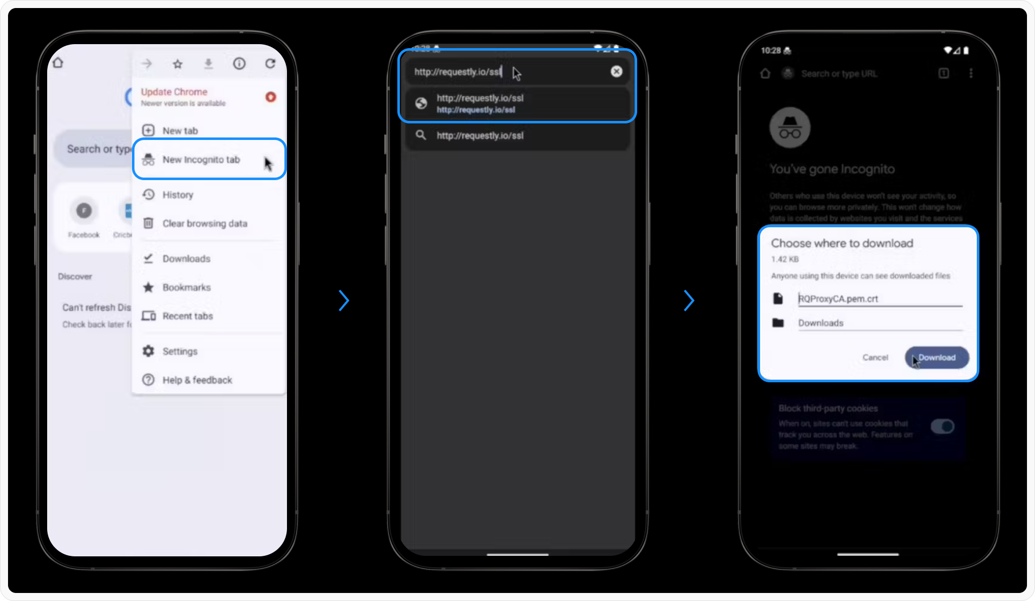 To intercept HTTPS traffic, you also need to install Requestly’s root CA certificate on your device:Download Certificate