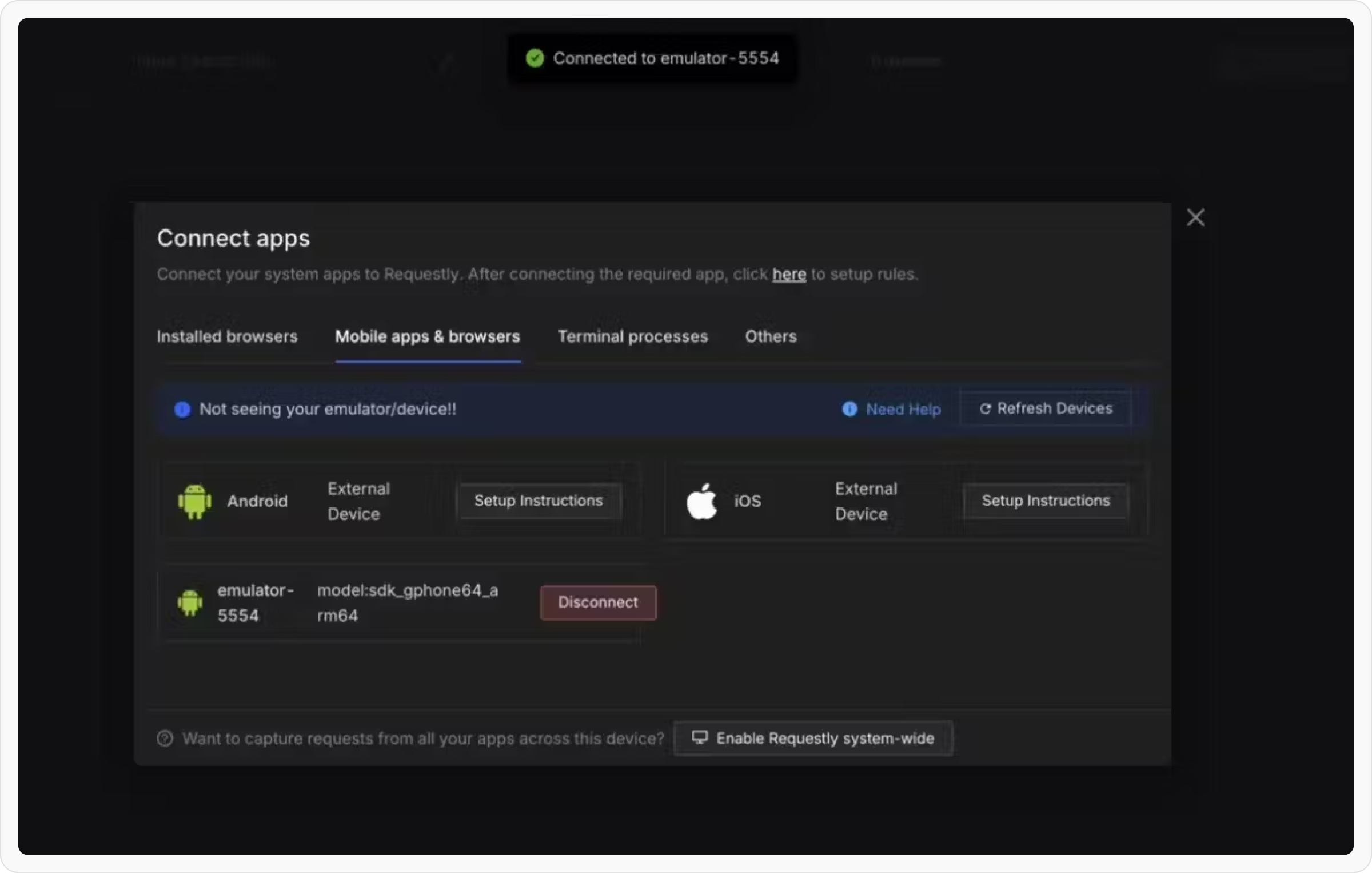 Requestly offers a one-click setup for Android emulators using Desktop App version 1.7.0+. Here’s how:1