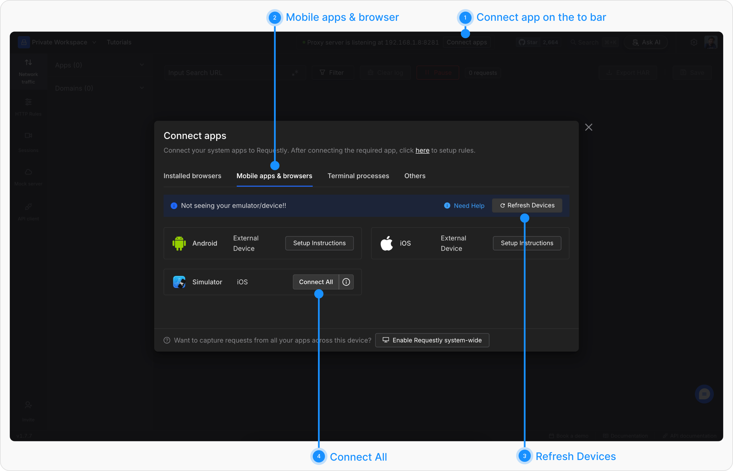 After running the above command, go back to Requestly and click Refresh Device again. Your simulator should now appear in the list.