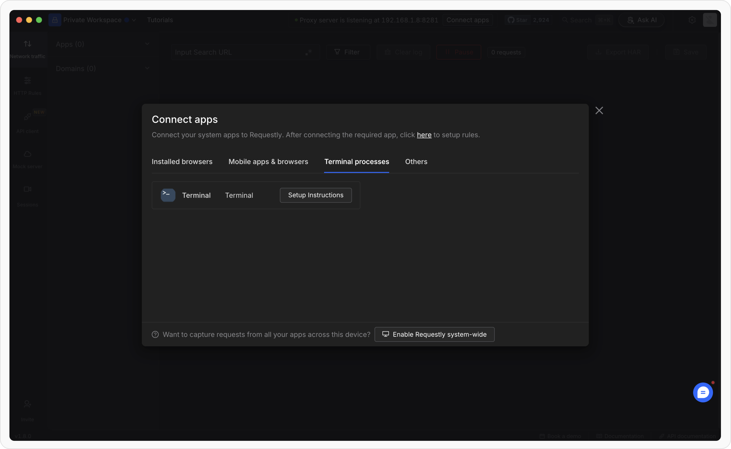 Go to the Requestly desktop app and click on the Connect apps button. A popup modal will appear.
