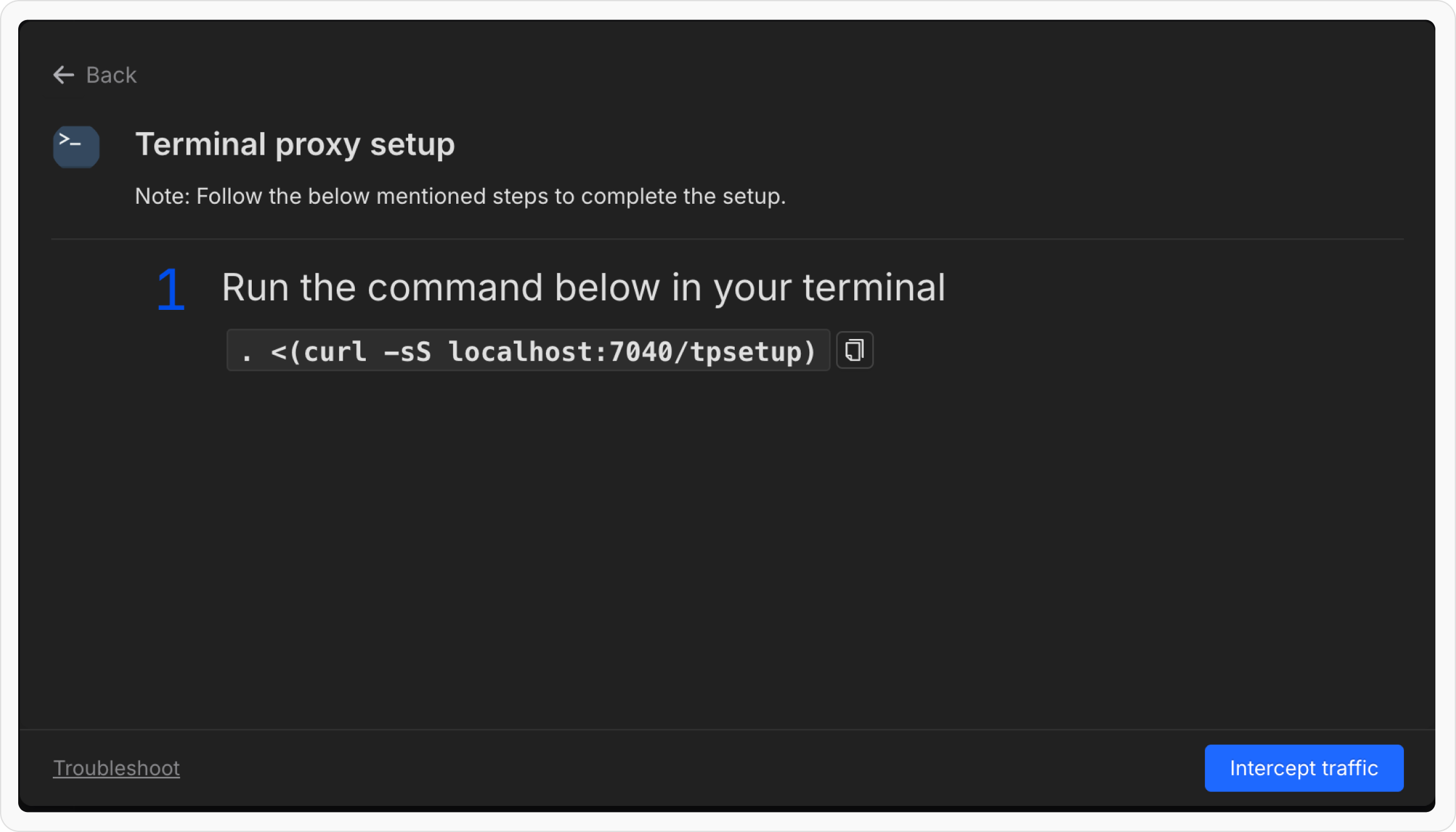 Open the terminal where you will start your Node.js server and paste the copied command. Press Enter to execute it.If the command runs successfully, you should see a confirmation message in your terminal indicating that Requestly interception is enabled.
