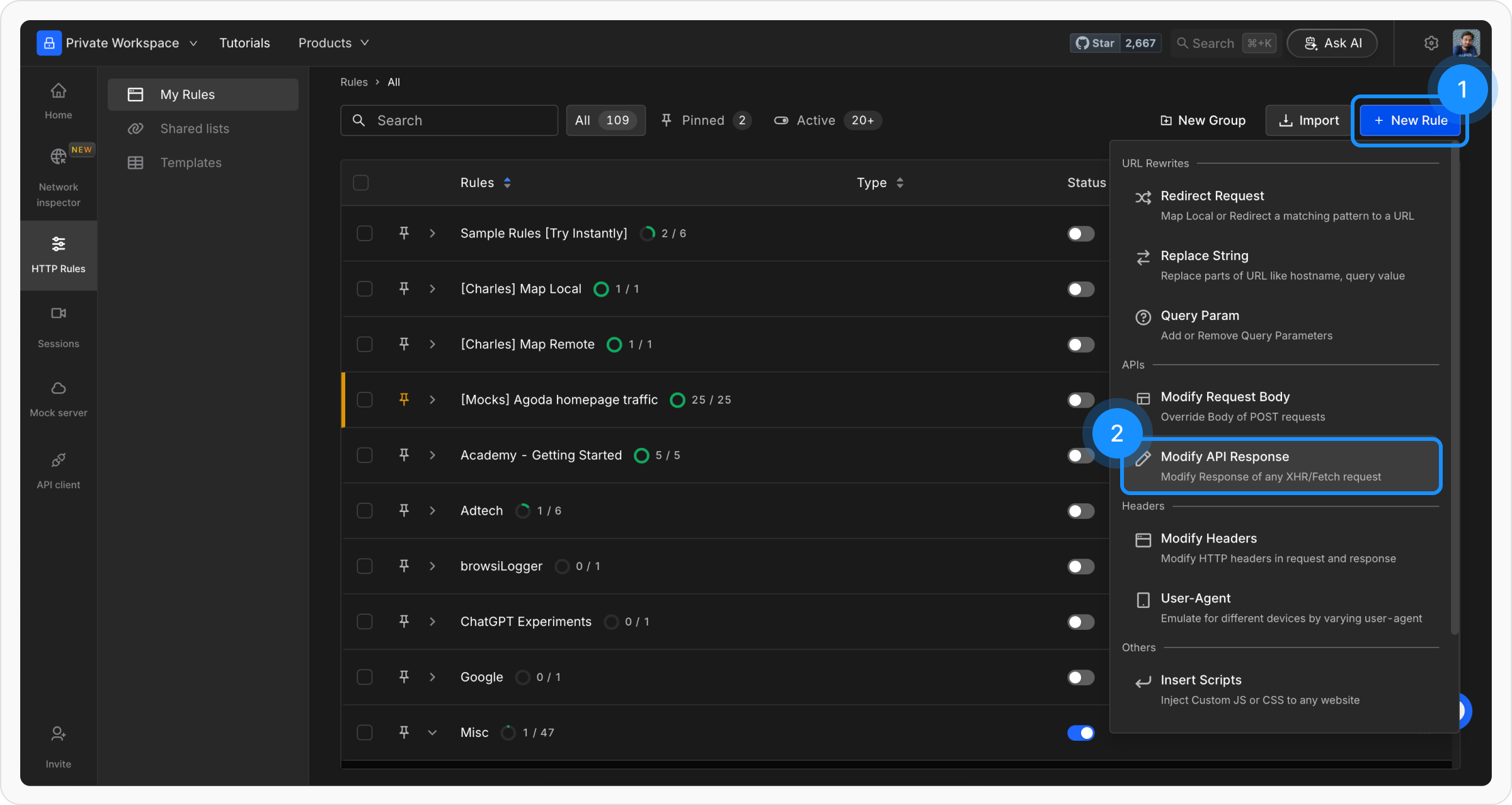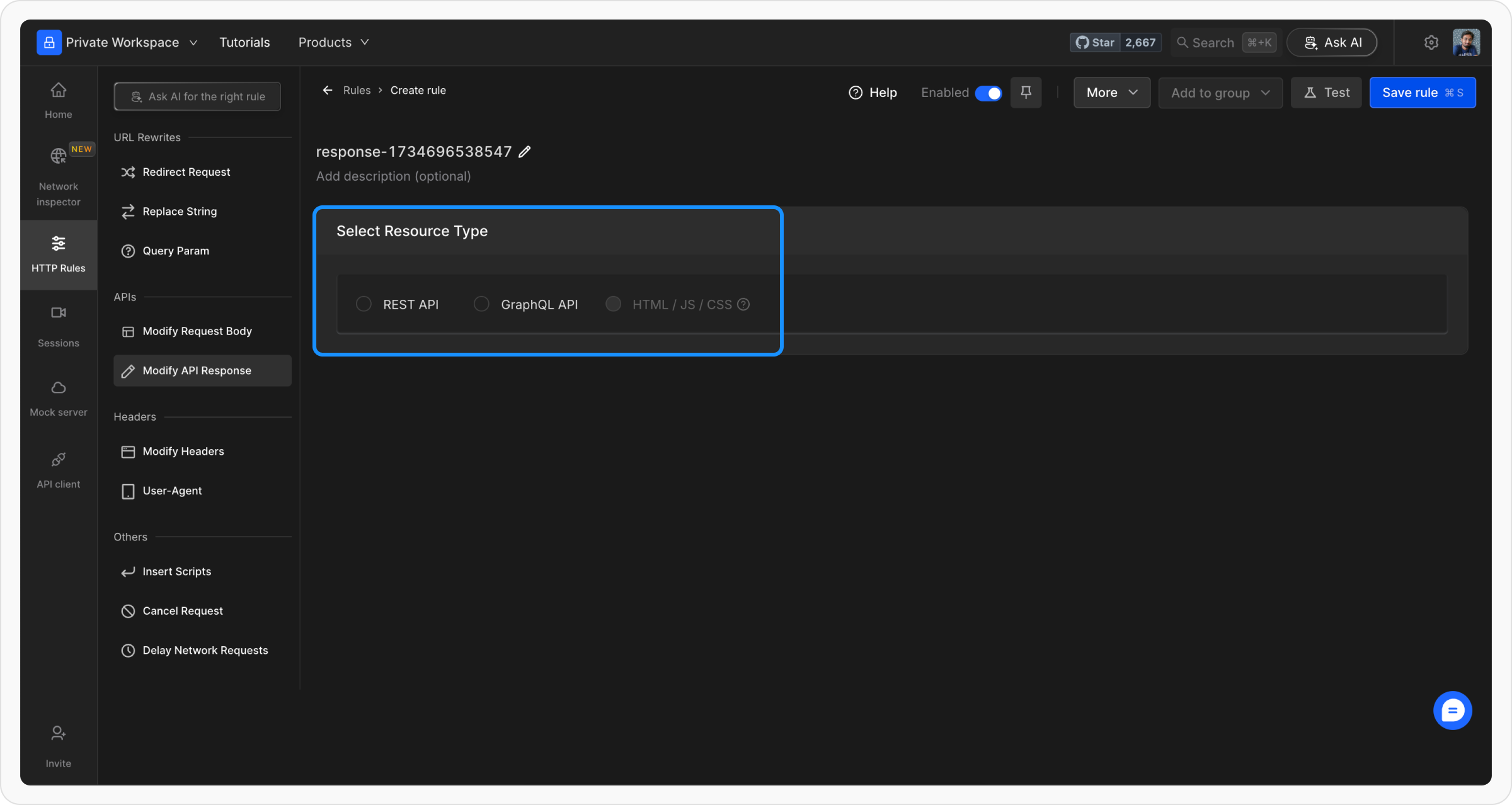 + New Rule and choose the Modify API Response option.