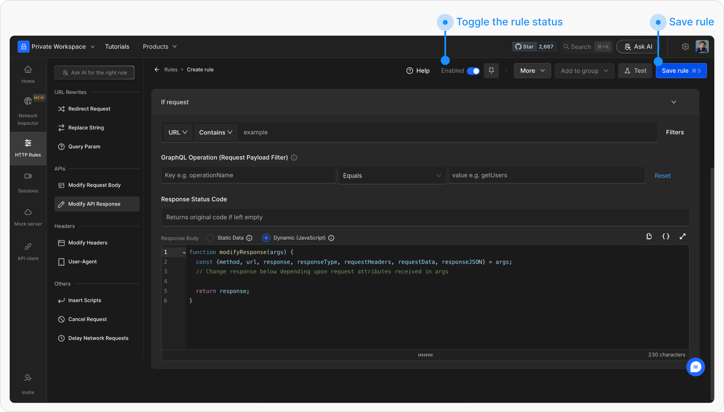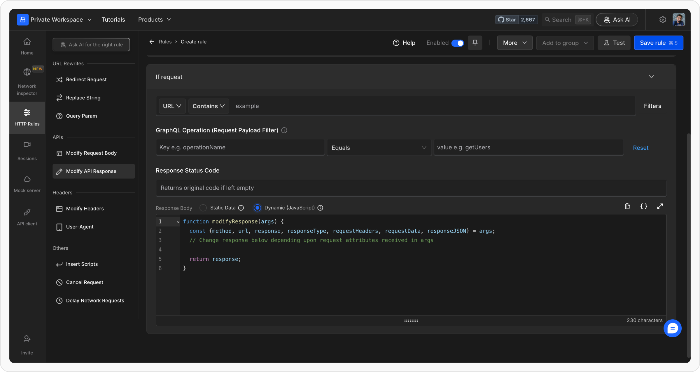 Dynamic Modification Script (JavaScript): Use JavaScript to modify responses dynamically. The script provides access to parameters like: