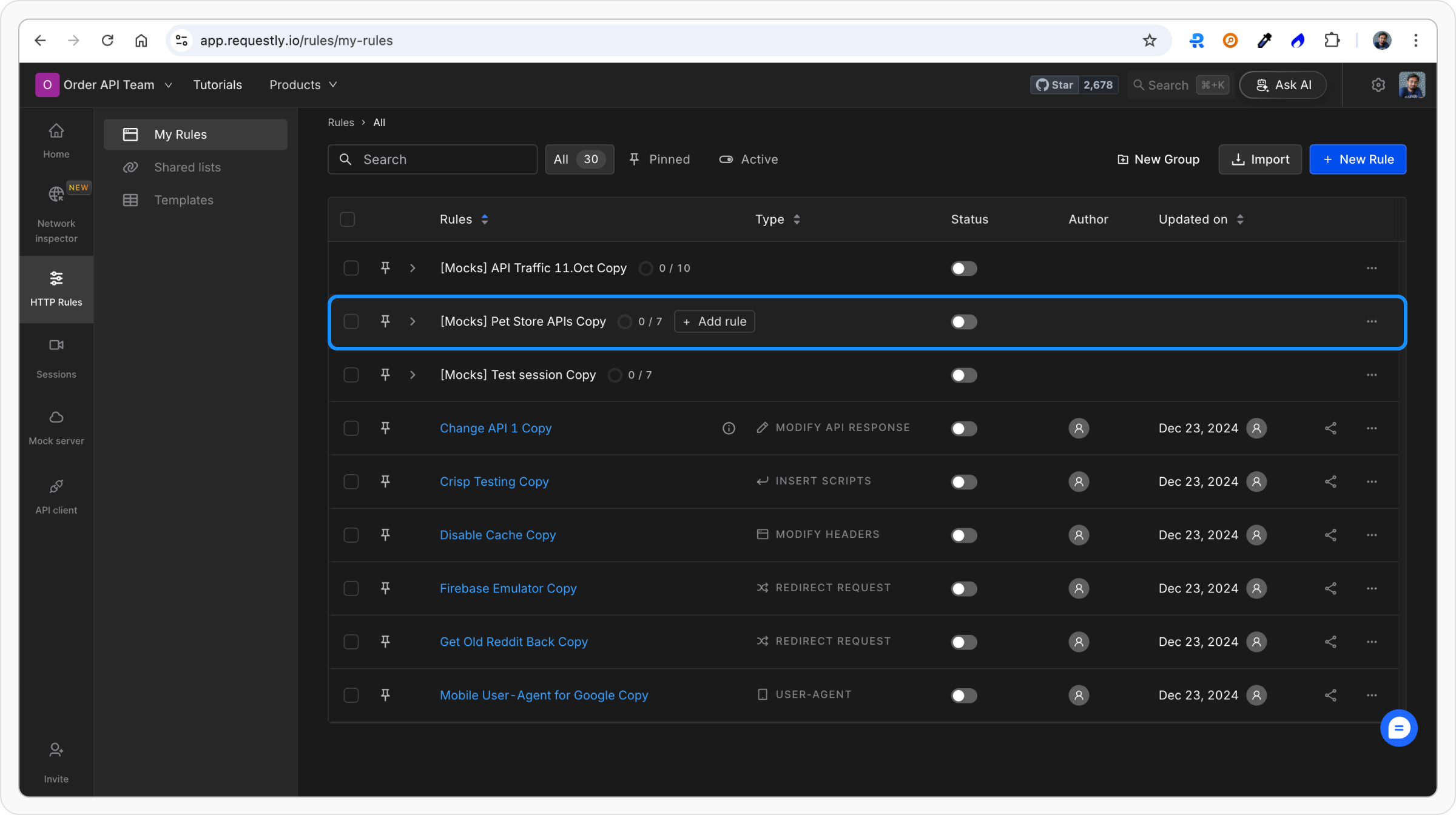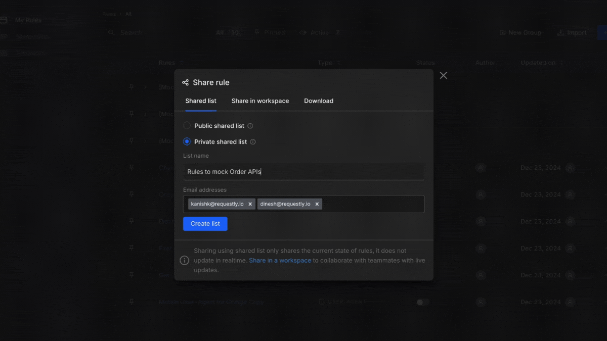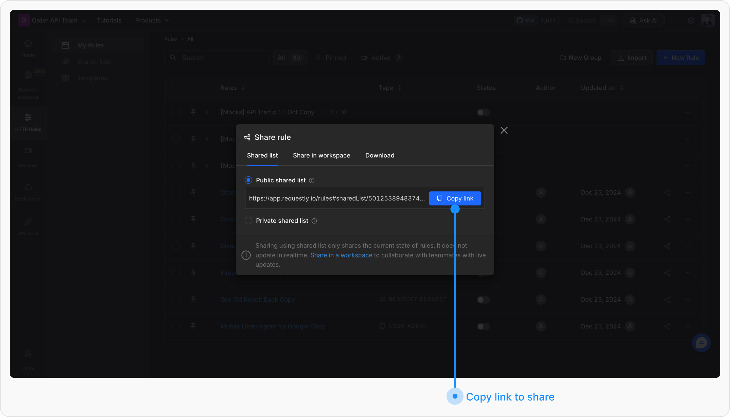 A Shared List is a convenient way to share HTTP rules using a single shareable link. You can create a Shared List for team collaboration or distribution while maintaining control over accessibility.
