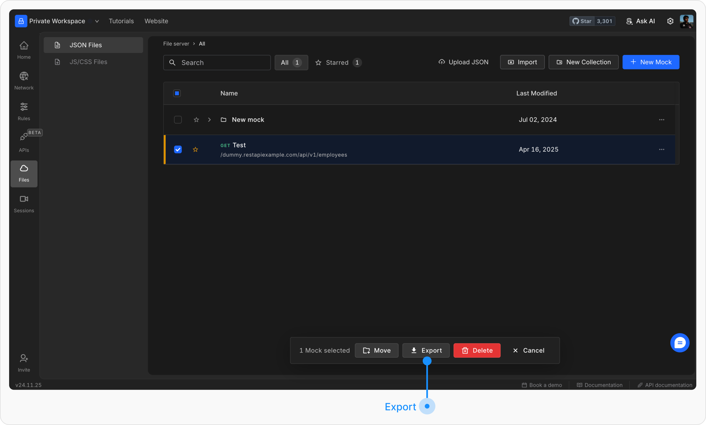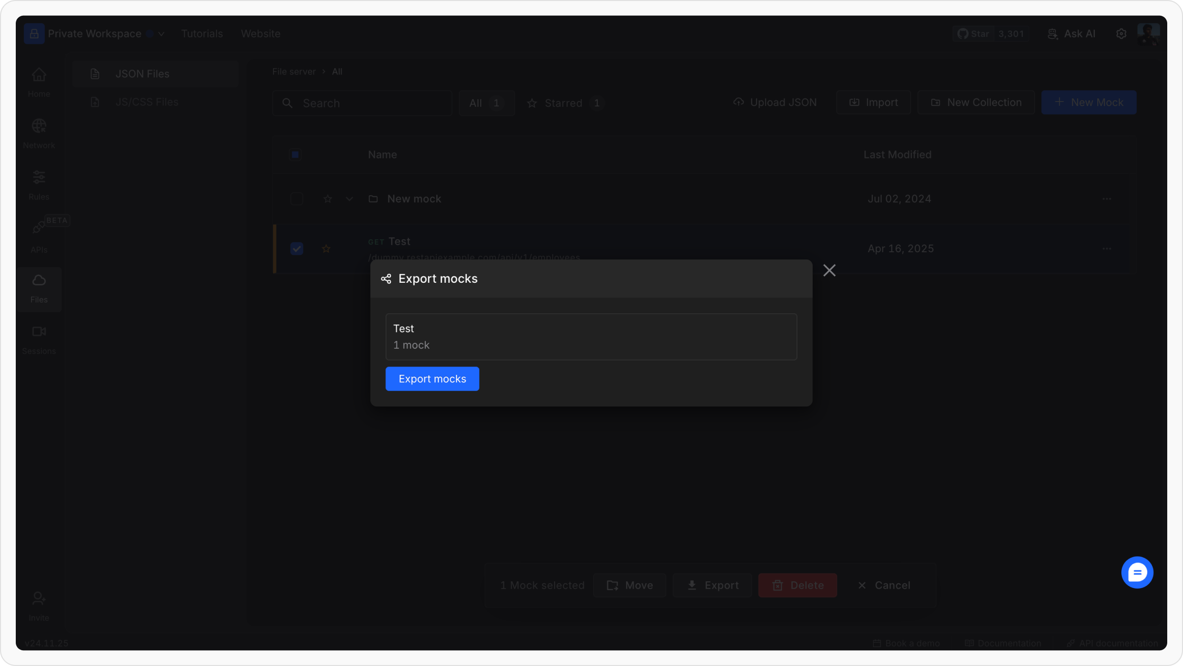 Requestly will prepare your selected files for export. Click Export Files to download the JSON file.