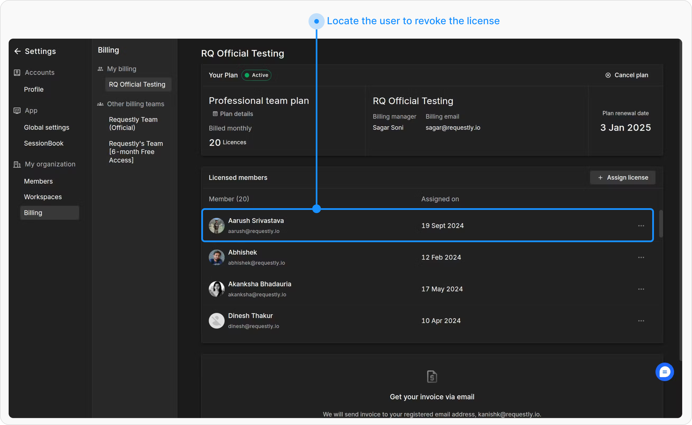 The Billing Dashboard provides a simple way to manage license holders, ensuring your team has seamless access to premium features.Assigning a License