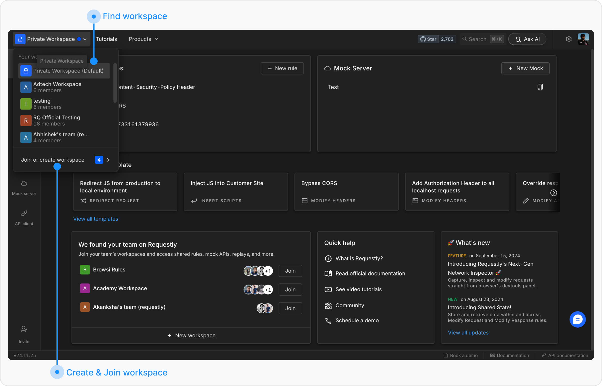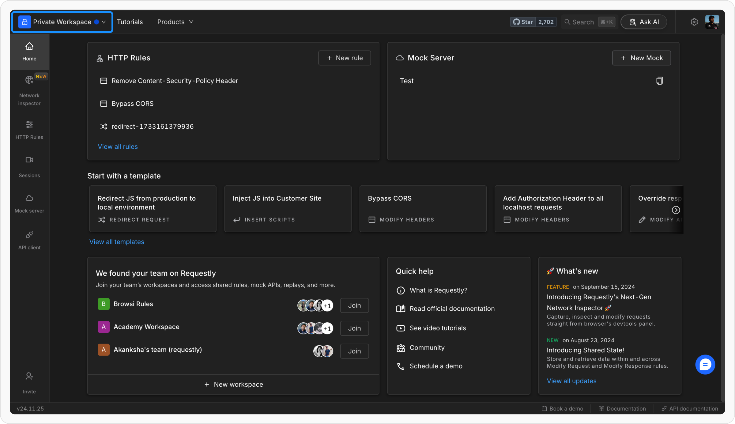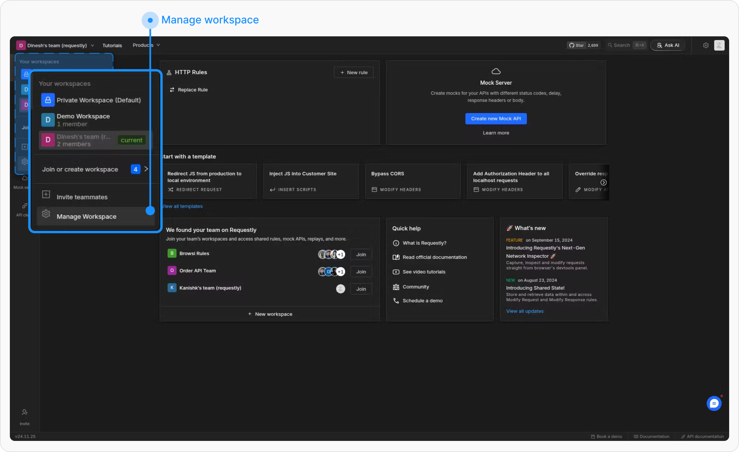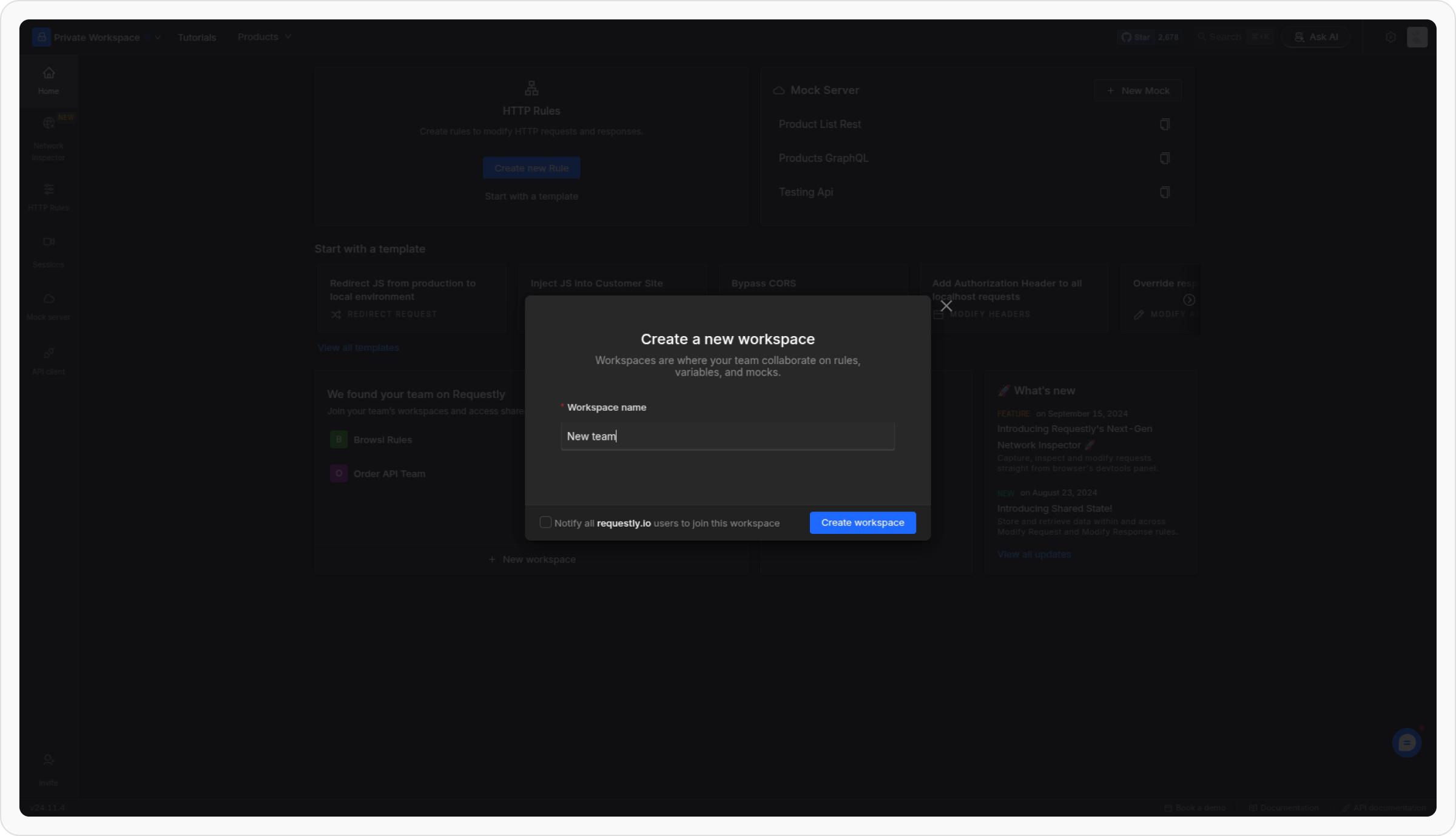 Requestly’s Team/Shared Workspaces make collaboration easy by syncing all the workpace data between members can work together on HTTP rules, mock APIs, the API client, and sessions. Whether you’re debugging, testing, or managing API workflows, a shared workspace ensures your team stays in sync and productive.