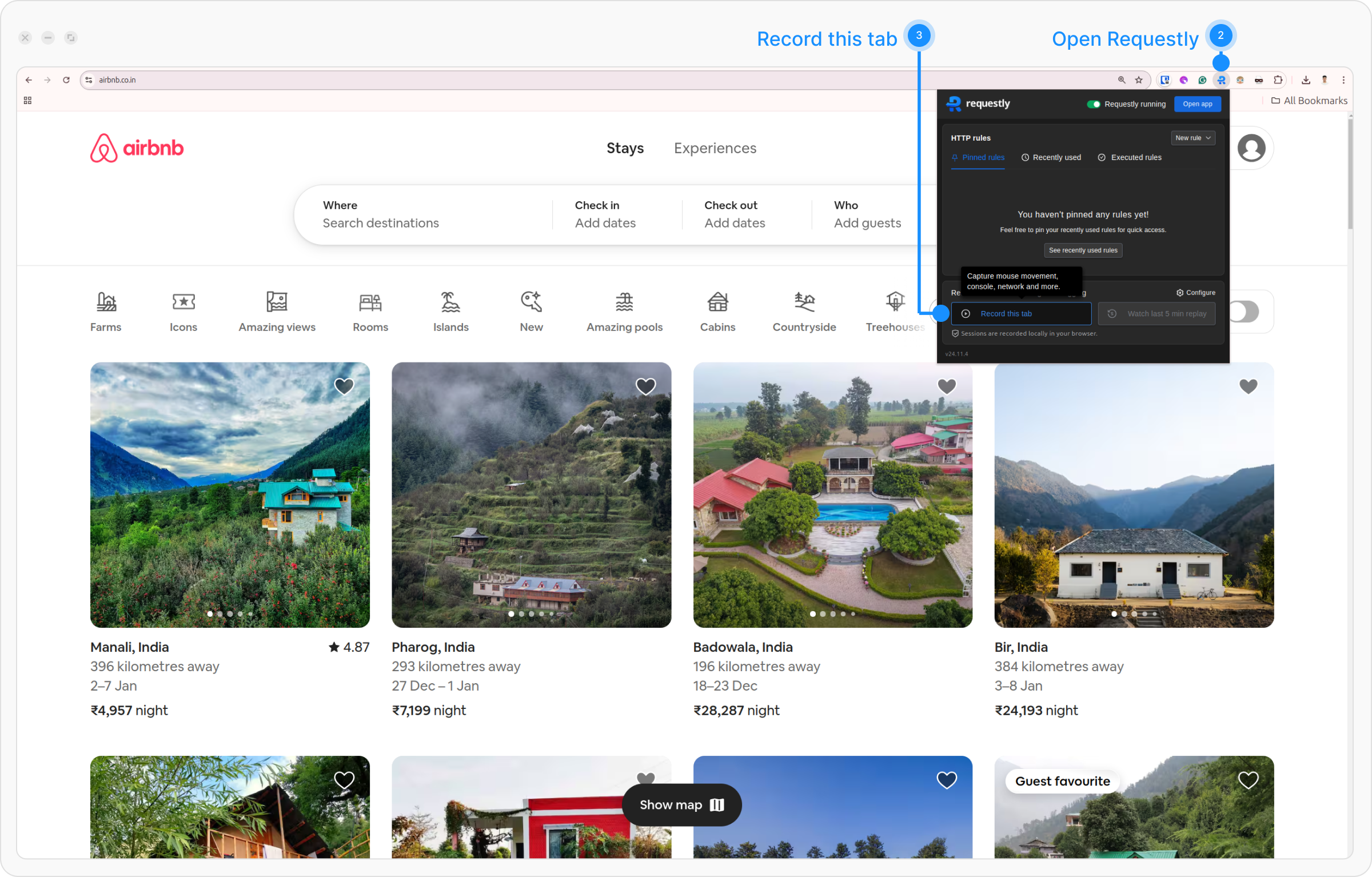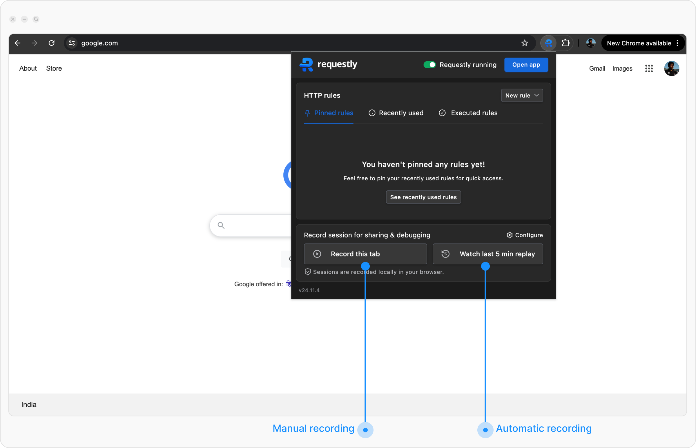 Click on Watch Last 5 Min Replay in the popup. If you have configured Requestly to auto-record only selected domains then it will only be available on those domains.