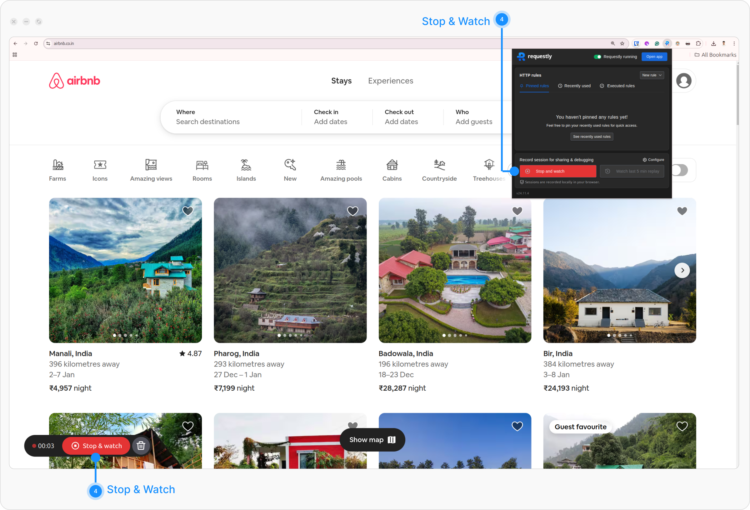 Once you’re finished, click the Stop & Watch button, either from the extension popup or from the Requestly widget at the bottom-left corner.