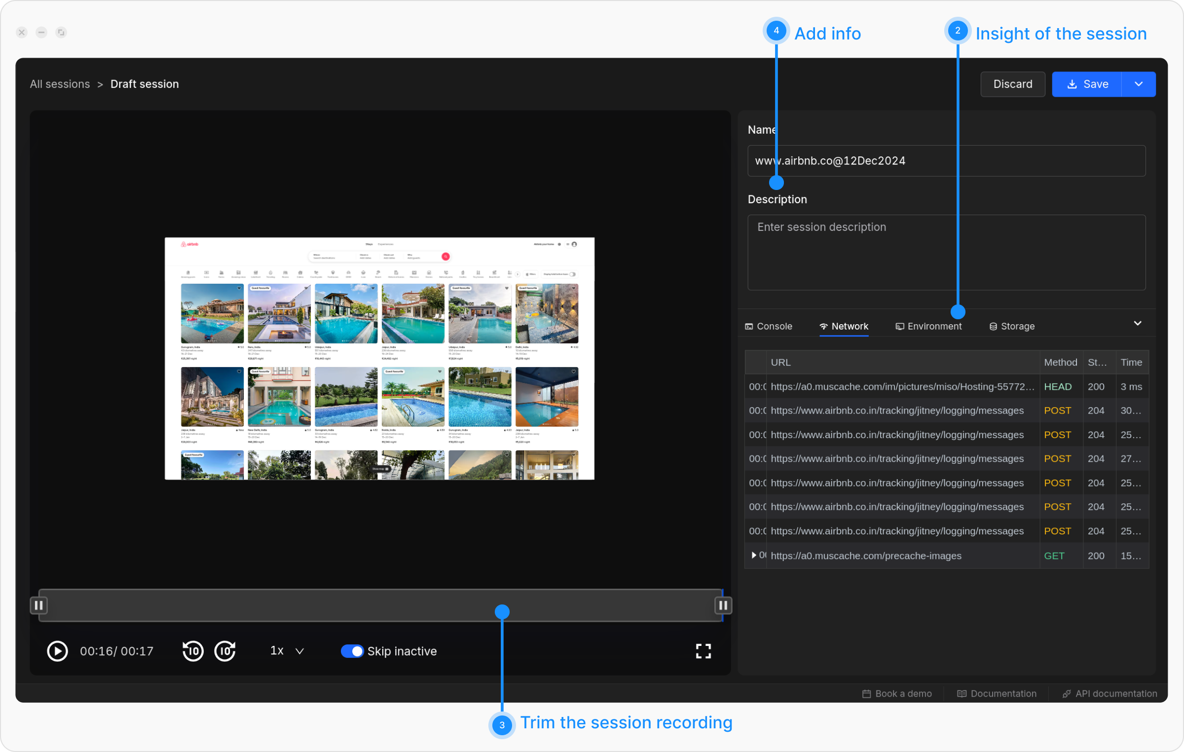 After recording the session, it enters a draft state, allowing you to review and make edits. You can trim the video, add a title and description, and make any other adjustments before saving it. During this time, the session is stored in the local storage of your browser only.