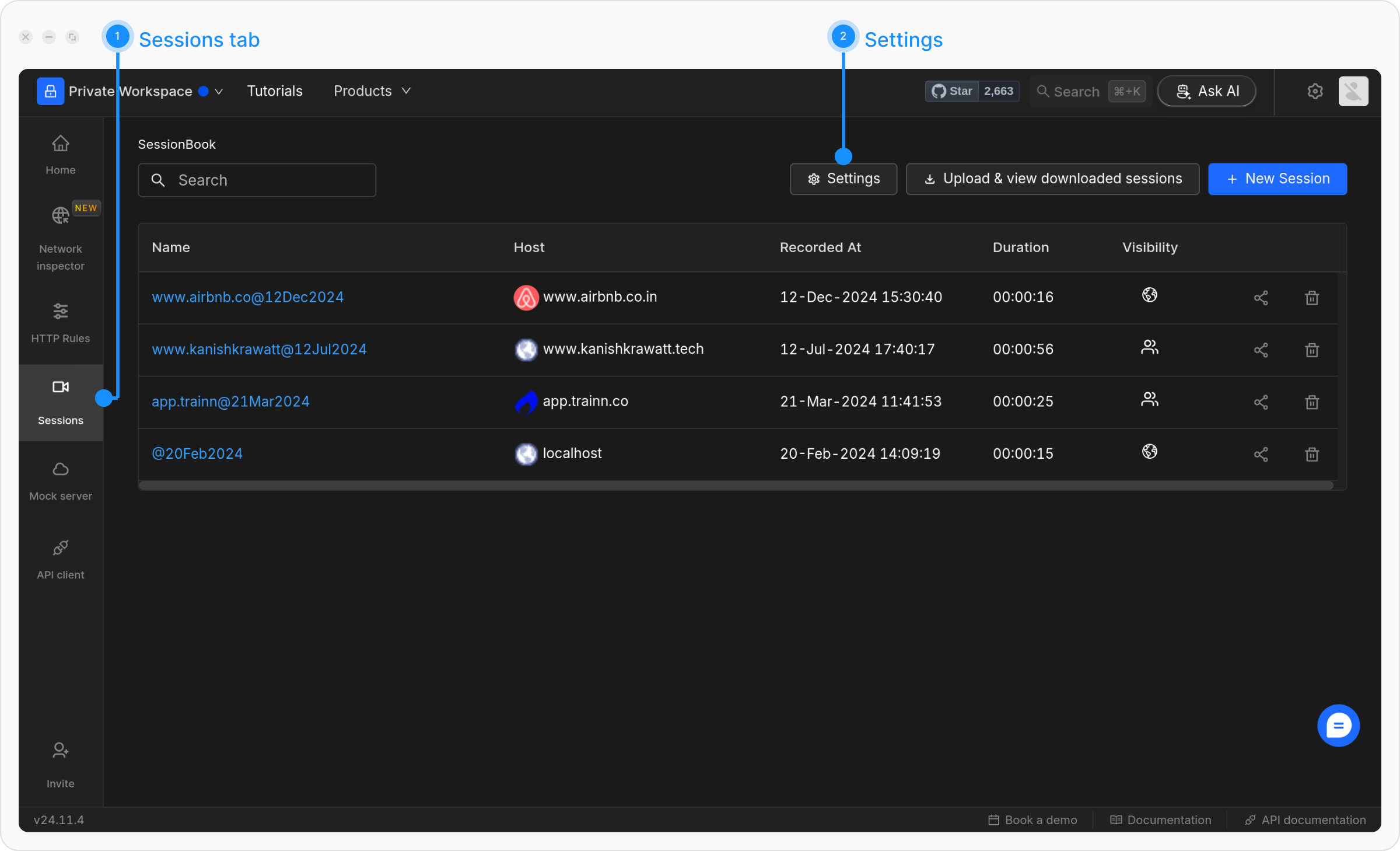 Go to the Sessions tab from the left-hand menu in the Requestly web app.