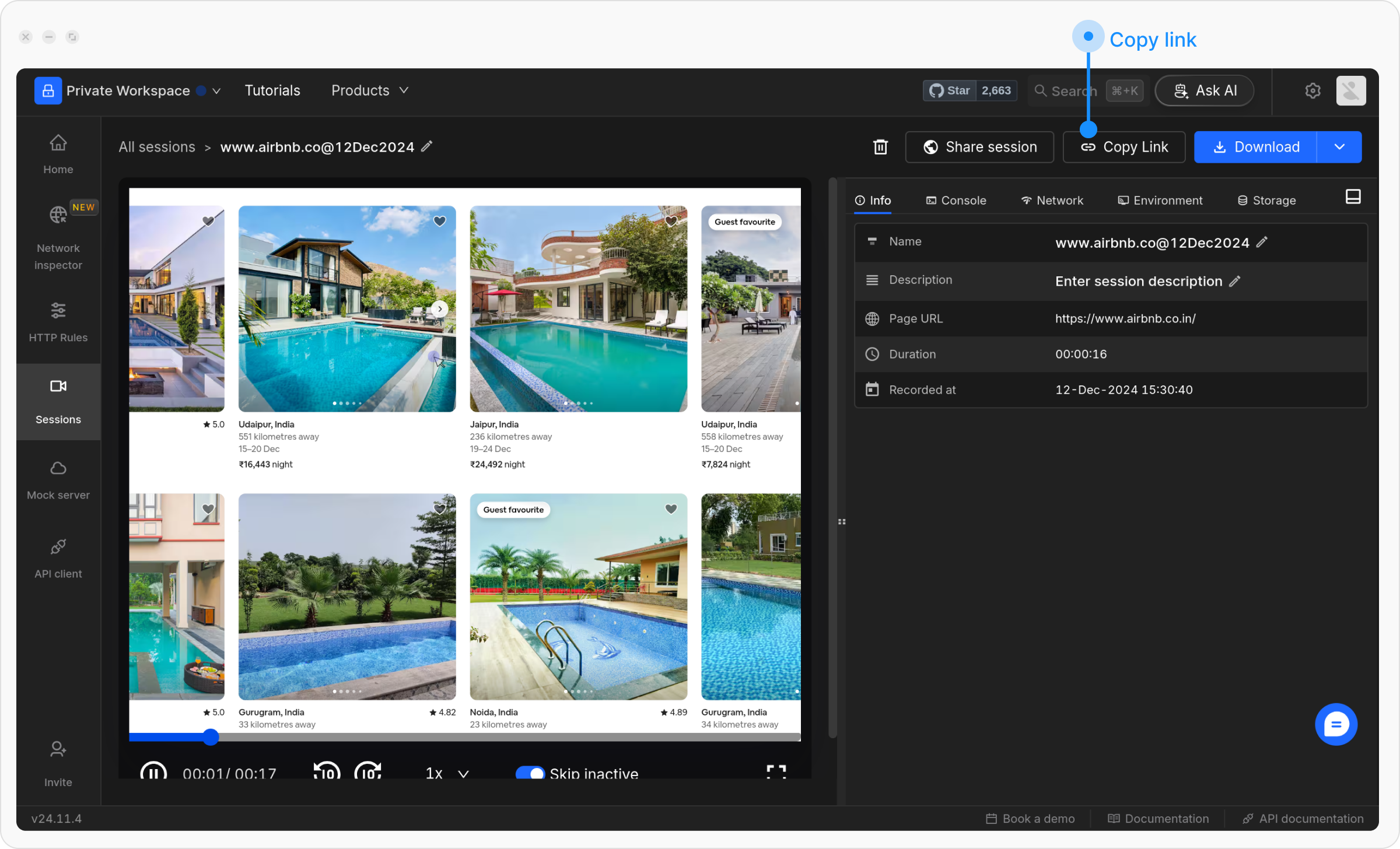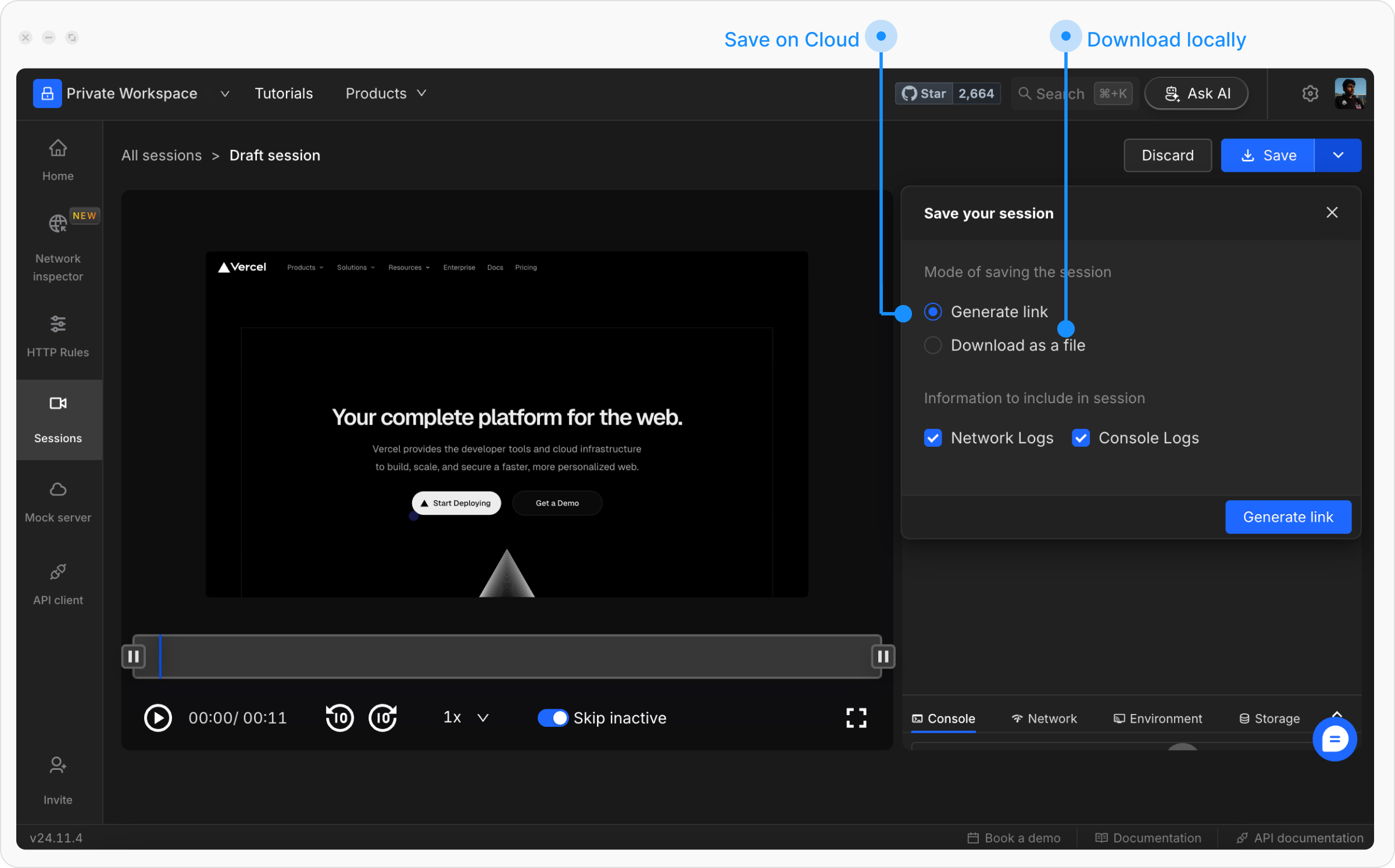 The recorded session draft will open in a new browser tab. There you can either save it or share it with developers.