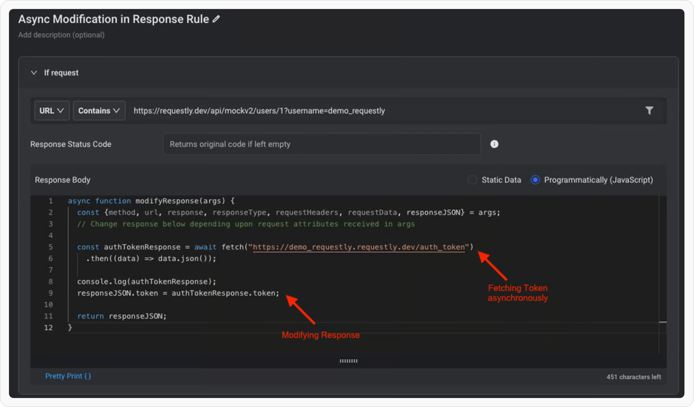 In this example, we’ll try to hit an external URL to fetch the auth_token and then add the token in the original response.Rule: https://app.requestly.io/rules#sharedList/1677765397812-Async-Modification-Response-Rule